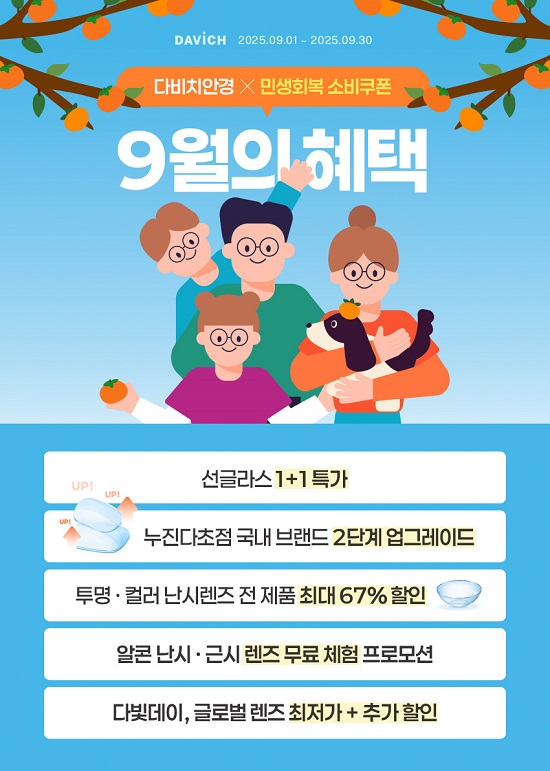 또한 ▲선글라스 1+1특가 ▲안경·콘택트렌즈 구매 시 선글라스 2만원 할인 ▲누진다초점 국내·수입 브랜드 1단계 업그레이드 ▲누진다초점 국내 브랜드 2단계 업그레이드(PB-자테 한정) ▲근시억제 안경렌즈 에실로 스텔리스트 프리벤시아 코팅 무료 업그레이드 (9/15주문 건까지) ▲다비치렌즈 라이트 컬렉션 한 쌍 5000원 특가 등의 혜택을 제공한다.