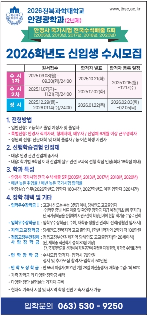 원서 접수 및 입학 관련 상세 정보는 전북과학대학교 입학처(063-530-9250)를 통해 확인할 수 있다.