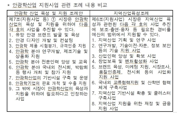 구체적으로 △유망 안경 브랜드 발굴 및 육성 △안경 디자인 개발 및 컨설팅 △안광학 제품 시험평가, 규격인증 지원 △연구개발, 제조기술 및 상품화 지원 △전문인력 양성 및 교육 △국내외 전시회, 박람회 등 행사 개최 및 참가 지원 △기반시설 구축 및 운영 △판로 개척 및 수출 지원 △그 밖에 시장이 안광학산업의 육성과 지원을 위하여 필요하다고 인정하는 사업 등이다.