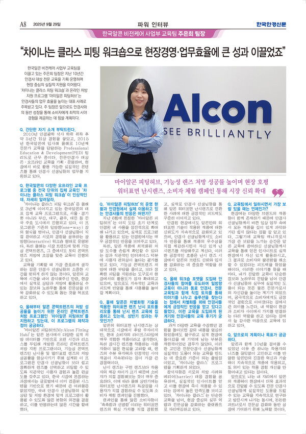앞으로도 나는 내 자리에서 알콘의 제품력이 현장에서 더욱 효과적으로 전달될 수 있도록 전문 안경사 선생님들께 실질적인 도움을 드릴 수 있는 교육을 지속적으로 연구하고 발전시켜 나가는 동시에, 든든한 파트너로서 전문성 강화와 동반 성장에 기여하기 위해 노력할 것이다.