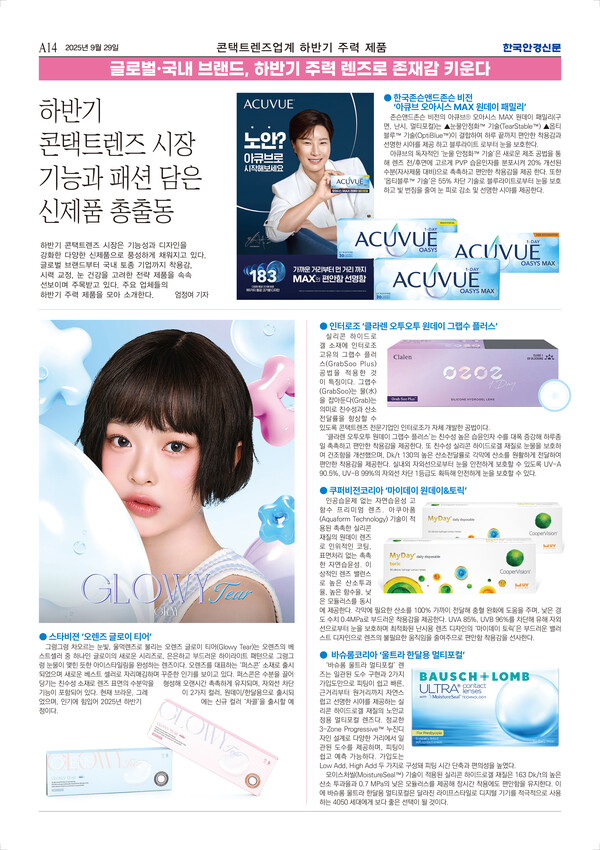 하반기 콘택트렌즈 시장은 기능성과 디자인을 강화한 다양한 신제품으로 풍성하게 채워지고 있다. 글로벌 브랜드부터 국내 토종 기업까지 착용감, 시력 교정, 눈 건강을 고려한 전략 제품을 속속 선보이며 주목받고 있다. 주요 업체들의 하반기 주력 제품을 모아 소개한다.