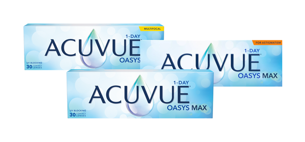 존슨앤드존슨 비전의 아큐브® 오아시스 MAX 원데이 패밀리(구면, 난시, 멀티포컬)는 ▲눈물안정화™ 기술(TearStable™) ▲옵티블루™ 기술(OptiBlue™)이 결합하여 하루 끝까지 편안한 착용감과 선명한 시야를 제공 하고 블루라이트 로부터 눈을 보호한다.