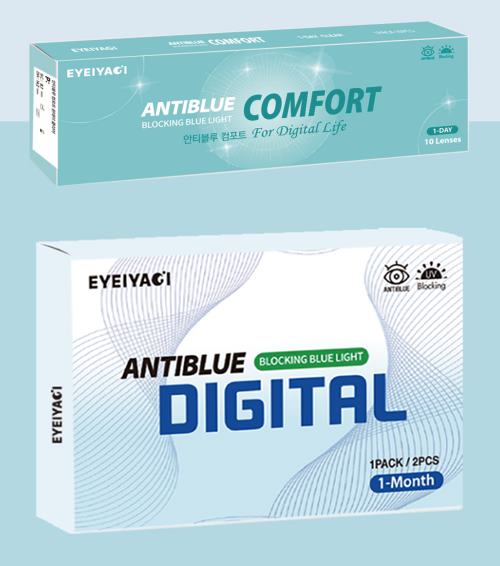 하루용 제품인 ‘안티블루 컴포트’와 한달용 렌즈 ‘안티블루 디지털’은 블루라이트 파장 영역(380~450nm) 중 405nm에서 가장 높은 차단율을 나타내는 블루라이트 차단 콘택트렌즈. ▲블루 필터 기술(Blue Filter Technology) ▲PC 코팅 기술(PC Coating Technology) ▲눈부심 방지 기술 ▲대비시력 기술로 탄생한 제품으로 디지털 중심의 라이프스타일에 적합한 렌즈로서 하루종일 눈부심과 빛 번짐 없는 선명한 시야를 제공한다. 주간 눈부심과 야간 빛 번짐을 억제함으로써 대비 감도 시력이 향상되고 선명한 시력과 눈 피로를 감소시킴으로써 편안한 착용감이 특장점이라 할 수 있다.
