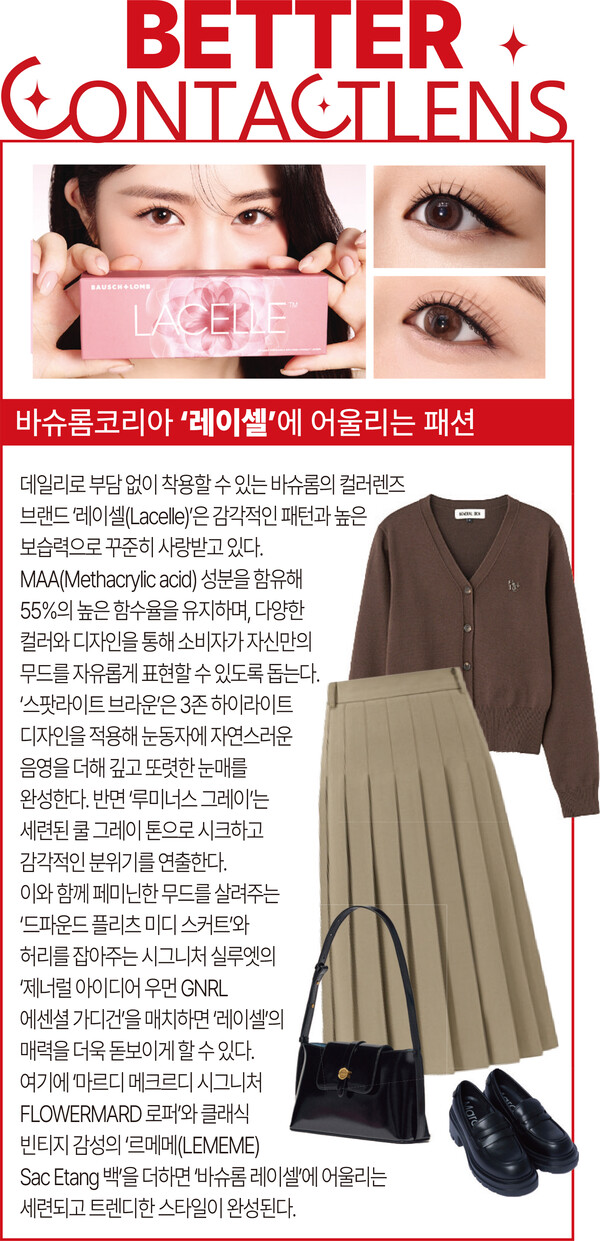 데일리로 부담 없이 착용할 수 있는 바슈롬의 컬러렌즈 브랜드 ‘레이셀(Lacelle)’은 감각적인 패턴과 높은 보습력으로 꾸준히 사랑받고 있다.