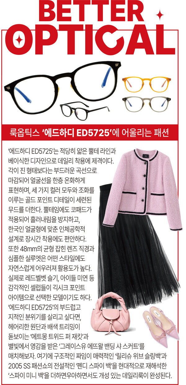 ‘에드하디 ED5725’의 부드럽고 지적인 분위기를 살리고 싶다면, 헤어리한 원단과 배색 트리밍이 돋보이는 ‘에트몽 트위드 퍼 재킷’과 별빛에서 영감을 받은 ‘그레이스유 에뜨왈 밴딩 샤 스커트’를 매치해보자.