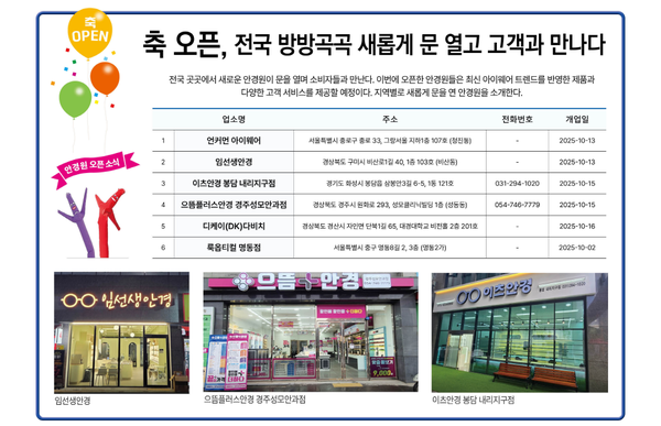 전국 곳곳에서 새로운 안경원이 문을 열며 소비자들과 만난다. 이번에 오픈한 안경원들은 최신 아이웨어 트렌드를 반영한 제품과 다양한 고객 서비스를 제공할 예정이다. 지역별로 새롭게 문을 연 안경원을 소개한다.