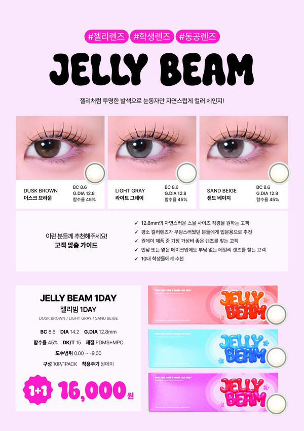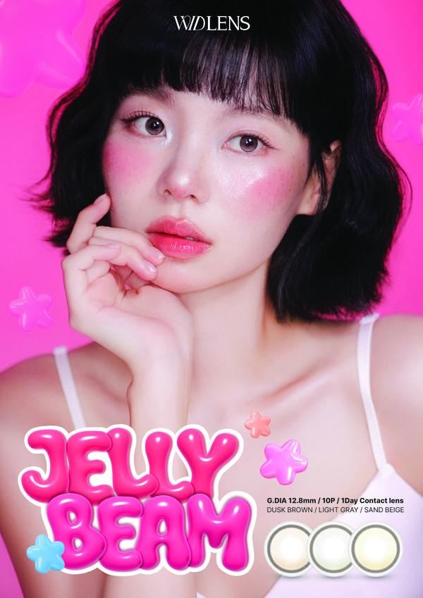 젤리 렌즈, 학생 렌즈, 동공 렌즈로 불리는 ‘젤리 빔’은 12.8mm의 자연스러운 스몰 사이즈와 부드러운 색감으로, 눈동자 본연의 색을 살리면서도 맑은 인상을 연출한다.