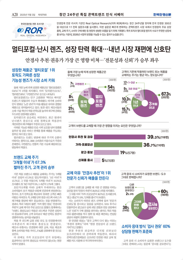 안경업계 전문 리서치 기관인 Real Optical Research(이하 ROR)에서는 창간 24주년을 맞이해 전국 안경원 300곳을 대상으로 1:1 전화 설문조사를 실시했다. 이번 설문은 빠르게 변화하는 콘택트렌즈 시장 속에서 안경원의 주요 성장 품목, 교체 주기, 소비자 구매 패턴 등 현장의 생생한 흐름을 짚기 위해 기획됐다. 특히 토릭과 멀티포컬 렌즈의 수요가 뚜렷한 성장세를 보이는 가운데, 2026년 시장의 방향을 가늠할 수 있는 결과가 눈길을 끈다.