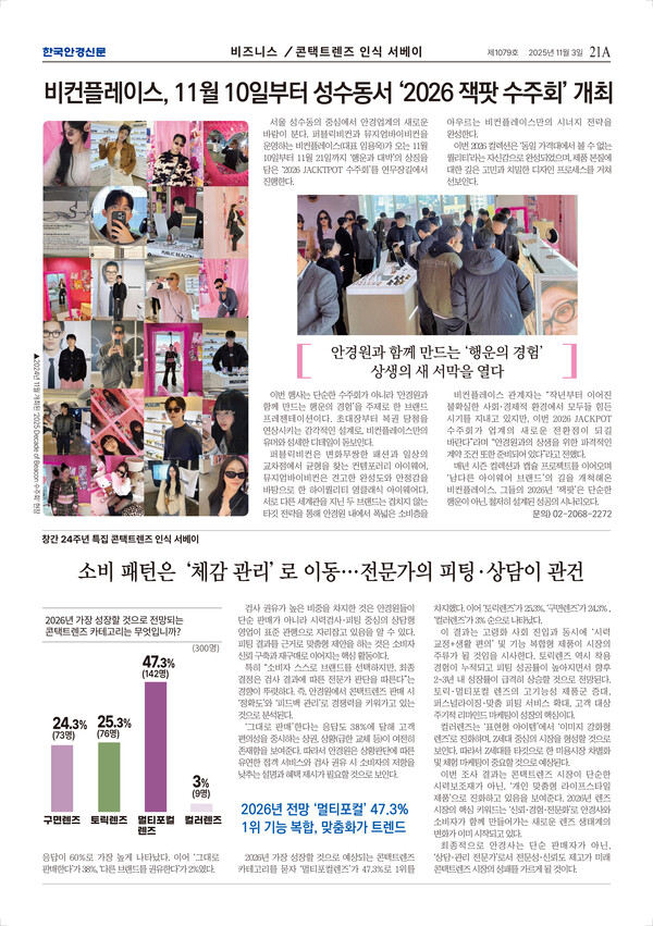 이번 조사 결과는 콘택트렌즈 시장이 단순한 시력보조재가 아닌, ‘개인 맞춤형 라이프스타일 제품’으로 진화하고 있음을 보여준다. 2026년 렌즈 시장의 핵심 키워드는 ‘신뢰·경험·전문화’로 안경사와 소비자가 함께 만들어가는 새로운 렌즈 생태계의 변화가 이미 시작되고 있다.