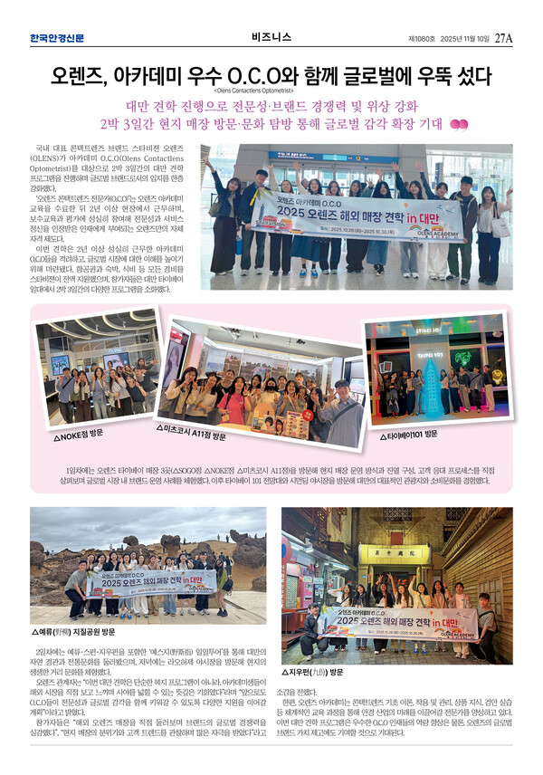 오렌즈 관계자는 “이번 대만 견학은 단순한 복지 프로그램이 아니라, 아카데미생들이 해외 시장을 직접 보고 느끼며 시야를 넓힐 수 있는 뜻깊은 기회였다”라며 “앞으로도 O.C.O들이 전문성과 글로벌 감각을 함께 키워갈 수 있도록 다양한 지원을 이어갈 계획”이라고 밝혔다.