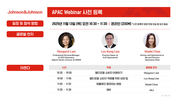 한국존슨앤드존슨 비전 관계자는 “이번 웨비나는 글로벌 시각에서 멀티포컬 콘택트렌즈에 대한 소비자 경험과 임상적 접근법을 심도 있게 다루는 자리”라며 “안경원 실무자들이 실제 상담과 처방에 바로 적용할 수 있는 실질적인 정보를 얻을 수 있을 것”이라고 밝혔다.