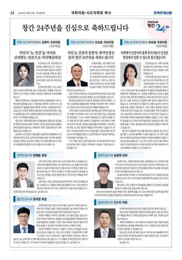 앞으로도 현장의 목소리를 담아내고, 업계가 한 단계 더 발전할 수 있도록 함께해 주시길 바랍니다. 저 또한 국회에서 안경사와 업계 종사자들이 안정된 환경에서 일할 수 있도록 힘쓰겠습니다. 다시 한 번 창간 24주년을 축하드리며, 한국안경신문의 무궁한 발전과 임직원 여러분의 건강과 행복을 기원합니다. 감사합니다.