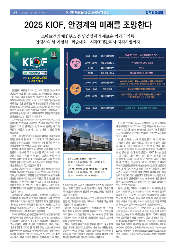 안경원의 새로운 먹거리로 가득 채워진 ‘2025 국제 안경광학산업 전시회(Korea International Optics Fair 2025, 이하 KIOF)’가 코앞으로 다가왔다. 오는 11월20~22일(목,금,토) 서울 코엑스마곡 전시장에서 개최되는 이번 전시회는 국내 안경산업의 부흥을 알릴 신호탄으로 기대받고 있다. 스마트안경 등 안경원의 새로운 먹거리는 물론 안경테와 안경렌즈, 콘택트렌즈, 광학기기 등 안경업계의 대표브랜드가 총출동해 다양한 신제품을 선보일 예정이기 때문이다.
